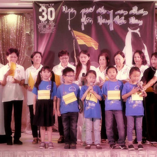 Các em học sinh của TTVNHB tham gia buổi Tưởng Niệm - Cầu Nguyện hát cho Quê Hương Đất Nước Việt Nam do nhóm Quỳnh Hoa tổ chức đêm 24-4-2019 tại nhà hàng Golden Sea, Anaheim, CA.
